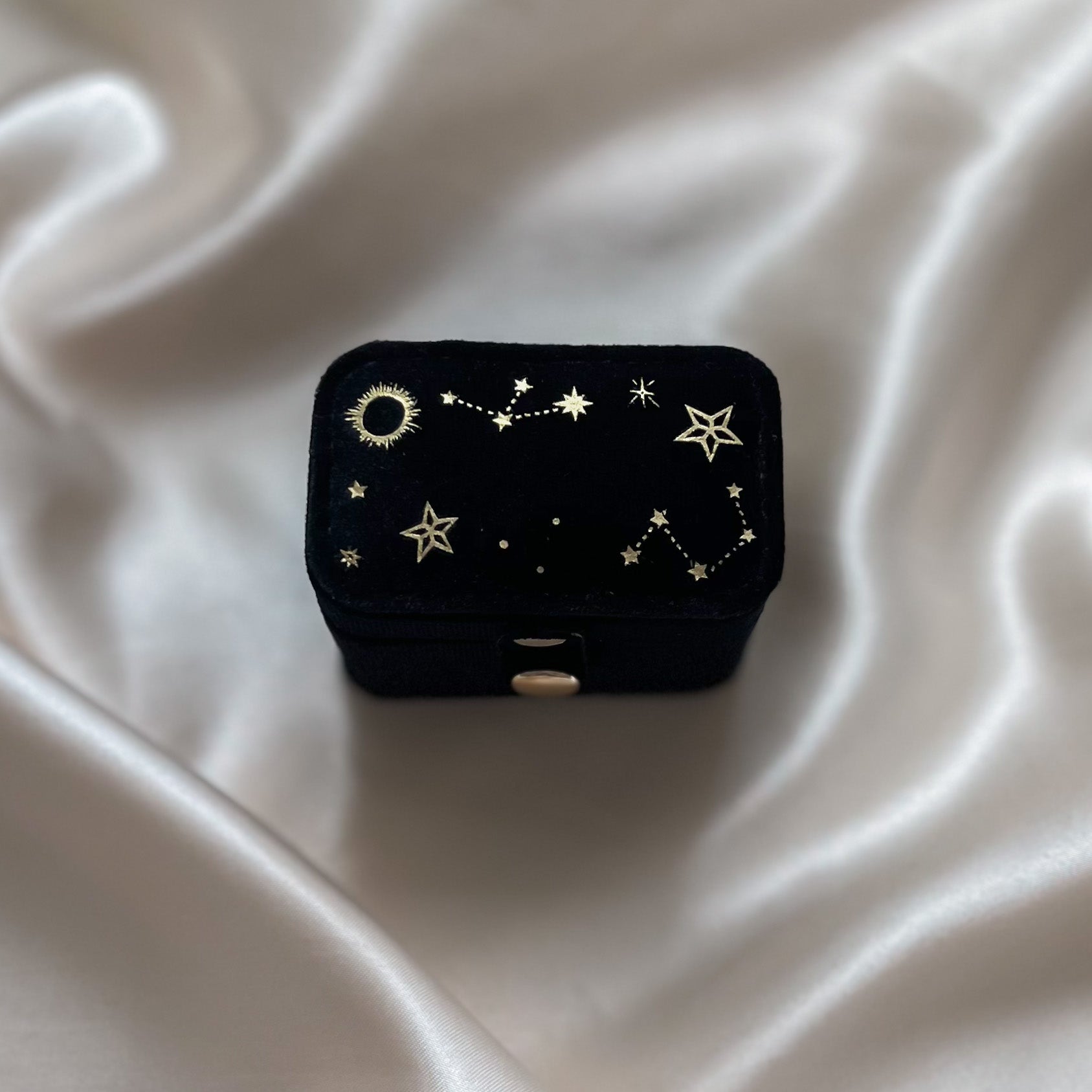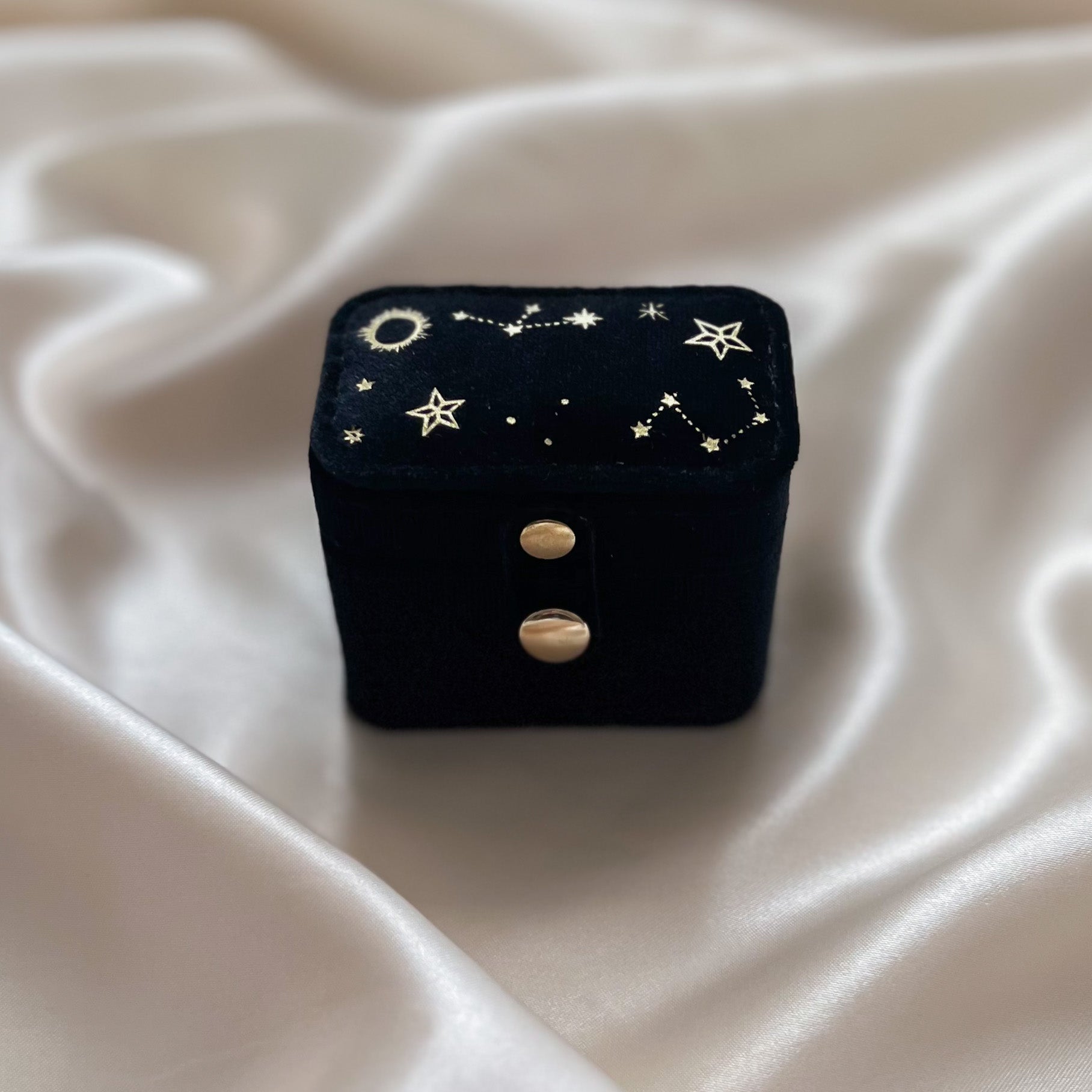 A wonderful little black velvet ring box featuring a star and constellation print in gold on the top of the case secured with a gold popper fastening. It is the perfect size to pop in your handbag or suitcase for keeping your rings and other small jewellery pieces safe on the go. It makes a wonderful gift for any jewellery lover.