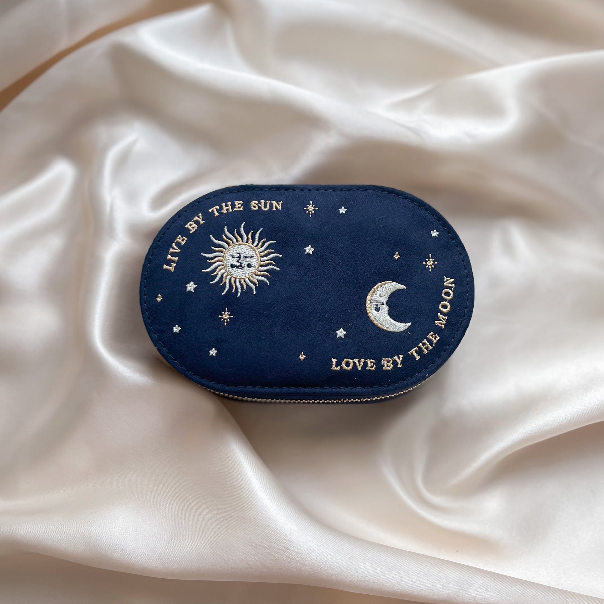 Coming in a deep navy, this stunning oval case is adorned with a celestial print and wording accenting the edges of the lid. In the top left, a silver and gold sun is embroidered alongside 'live by the sun' wording, whilst a silver and gold moon sits in the bottom-right corner above the wording 'love by the moon'.